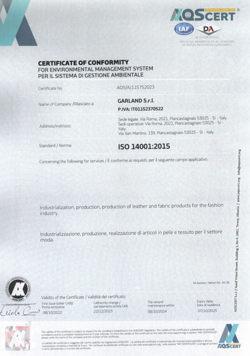 Garland S.r.l. opera secondo i più elevati standard di gestione ambientale, come dimostrato dal conseguimento della certificazione ISO 14001:2015. Questo riconoscimento attesta l’impegno costante dell’azienda nella riduzione dell’impatto ambientale dei propri processi produttivi, attraverso un sistema strutturato di gestione e miglioramento continuo. Un traguardo che riflette la volontà di Garland di coniugare eccellenza artigianale e sostenibilità, contribuendo alla tutela del territorio e delle generazioni future.